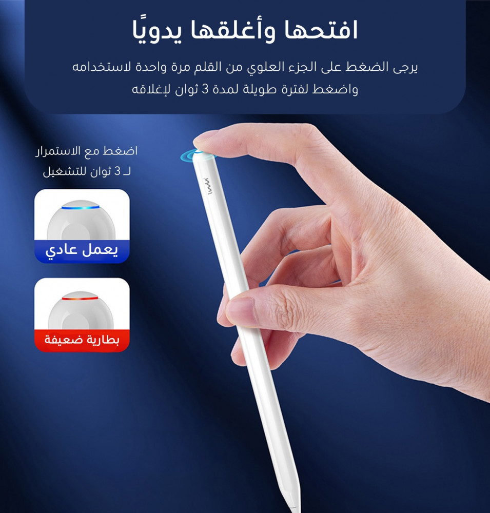 يتيح قلم Iwin المطور التفاعل مع آيباد عن طريق اللمسات المباشرة على القلم نفسه. يمكنك النقر مرتين بسرعة على القلم للتبديل بين أداة القلم والممحاة أو للوصول إلى الميزات الإضافية في التطبيقات المتوافقة .